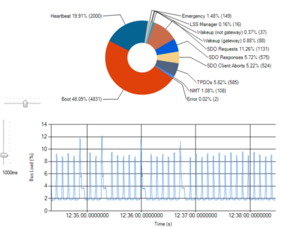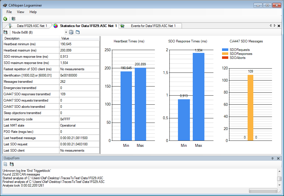 EmSA's Logxaminer hilft bei der Postanalyse solcher Aufnahmen. Es erstellt Statistiken und Ereignislisten auf einer konfigurierbaren Detailstufe. Dies verkürzt drastisch die Zeit, um "echte Ergebnisse" aus einer CANopen Log-Aufzeichnung zu bekommen. Statistiken werden nicht nur global produziert, es gibt dedizierte statistische Sichten für jeden Knoten, der während der Aufnahme im Netzwerk vorhanden ist.