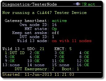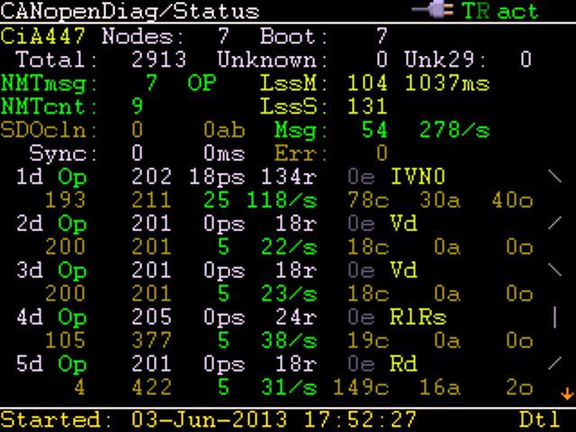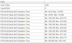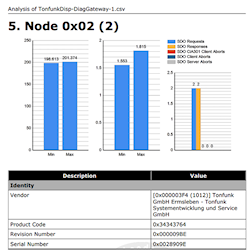 Für gefundene Knoten: NMT Status, Meldungslast, die vom Knoten erzeugt wird, Knoteninfo, wo verfügbar (z.B. Namen von virtuellen Geräten, die von einem Gerät implementiert werden) min/max Heartbeat, min/max SDO-Antwortzeiten, aktuelle Nachrichtenrate.